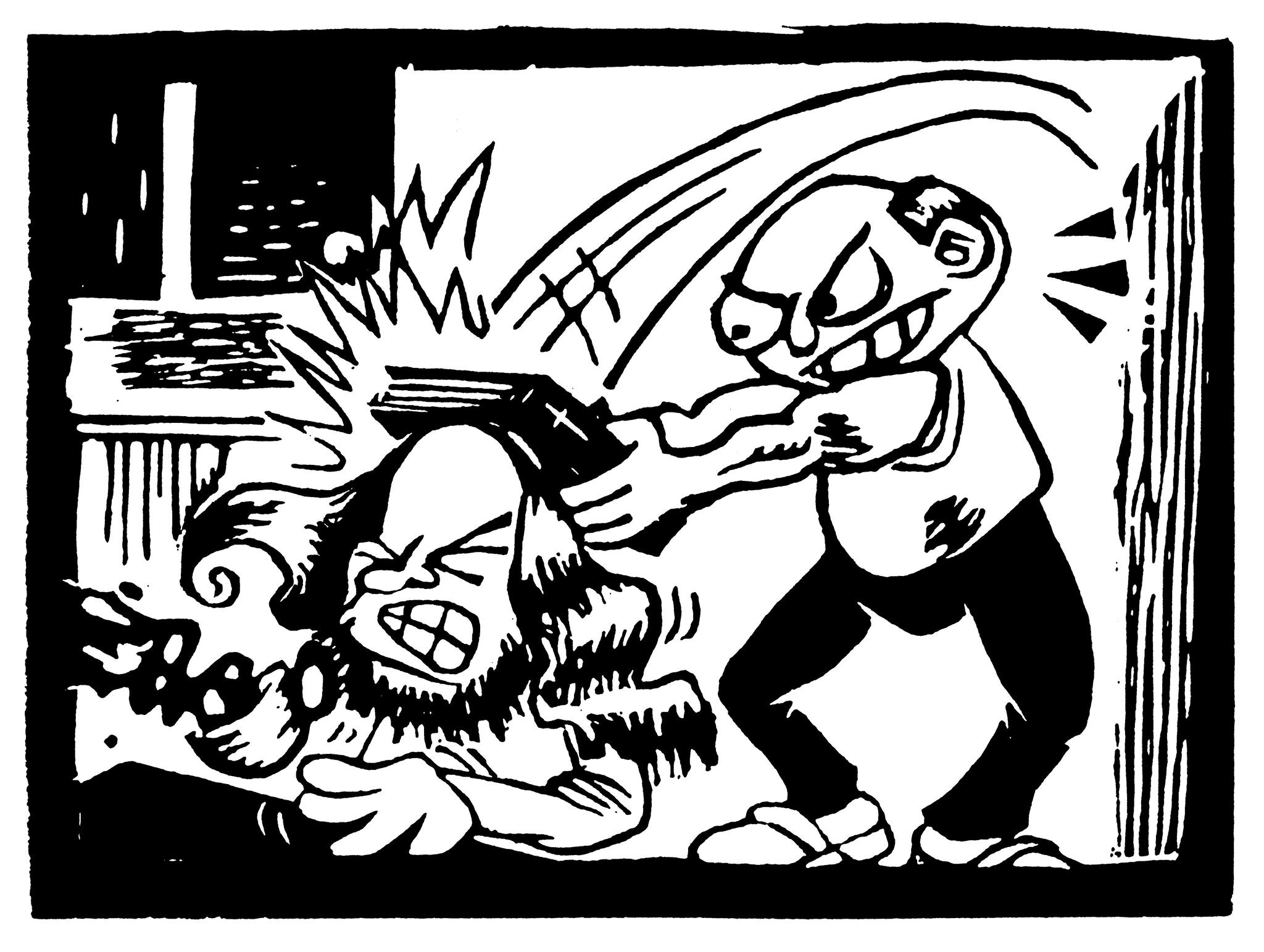 Utställningen fördjupar sig i David Liljemarks burleska serie “Besök av Jesus” från 1992. De två sidorna handlar om den våldsamme psykopaten Harry Johansson och utfördes i linoleumsnitt, en i seriesammanhang ovanlig teknik. Man får följa arbetsprocessen från idéanteckning till skisser, tryckplattor och monterade original med färgöverlägg – och även mottagandet, i form av en svavelosande insändare som ansåg att kristendomen skändats.