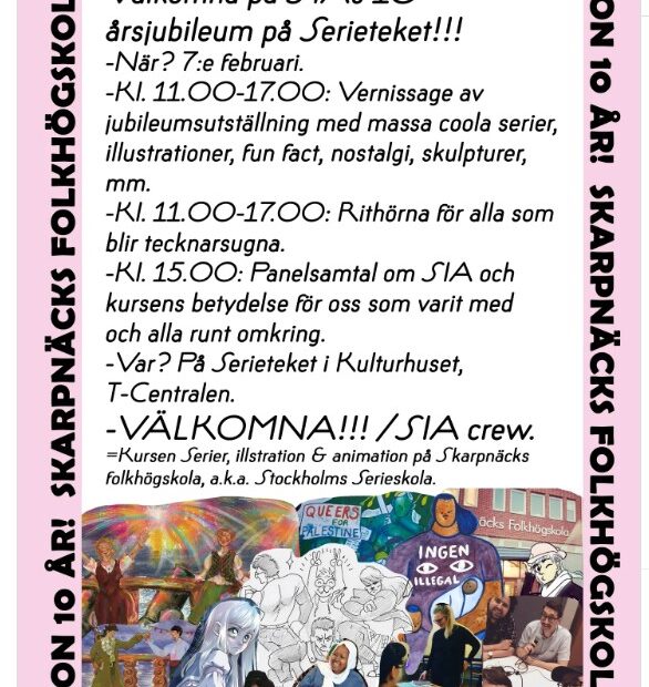 SIA, Serier Illustration Animation på Skarpnäcks folkhögskola fyller 10 år och firar med en jubileumsuställning på Serieteket.